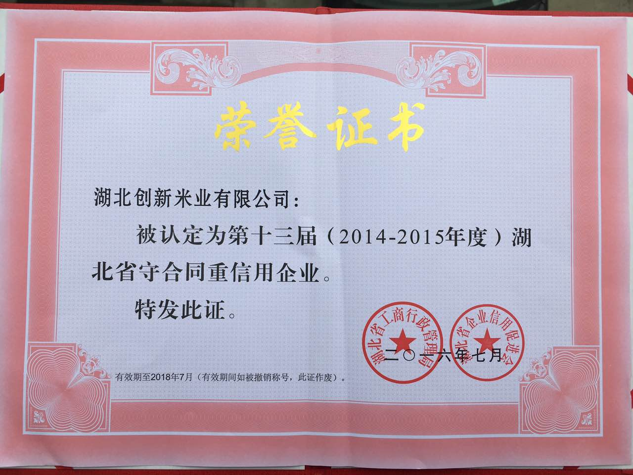 守合同重信用企業(yè)榮譽證書